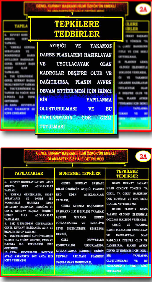 Ergenekon sanığı ve darbelerin planlayıcısı olmakla suçlanan emekli org. Şener Eruygur ve eski JİTEM Komutanı Albay Hasan Atilla Uğur´dan ele geçirildiği iddia edilen belge ve mektuplarda, devreye sokulan darbe planının deşifre olması durumunda ´gizli yapılanma sürece el koyacak´ yazılı olması cunta ekibinin çalışmalarını sürdürdüğünü ortaya koyuyor. ´İrtica eylem´ ve ´Kafes´ planını hazırlayan ekibin belgelerde yer alan ´B´ planını devreye soktuğu iddia ediliyor. Son günlerde artan ´sokak eylemi´yle ilgili de ´düğmeye o ekip bastı´ değerlendirmeleri yapılıyor. (Vakit)