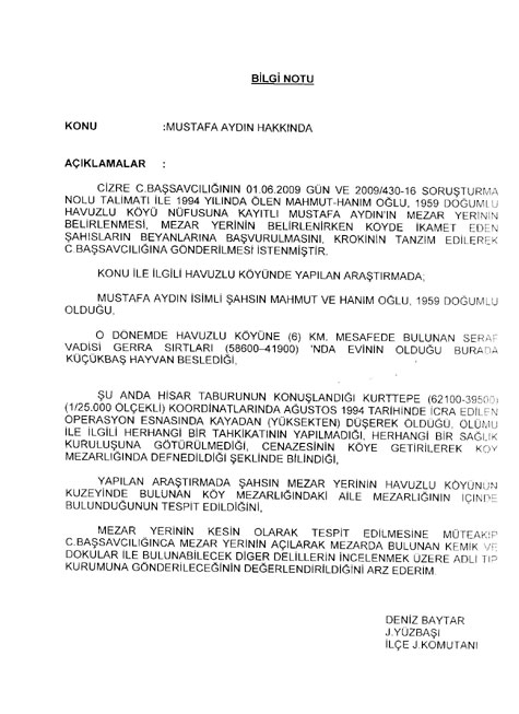 Mustafa Aydın isimli şahsın; şu anda Hisar Taburu´nun konuşlandığı Kurttepe (62100-39500 1/25000 ölçekli) koordinatlarında Ağustos 1994 tarihinde icra edilen operasyon esnasında kayadan (yüksekten) düşerek öldüğü, ölümü ile ilgili herhangi bir tahkikatının yapılmadığı, herhangi bir sağlık kuruluşuna götürülmediği, cenazesinin köye getirilerek köy mezarlığında defnedildiği şeklinde bilindiği, yapılan araştırmada şahsın mezar yerinin Havuzlu Köyü´nün kuzeyinde bulunan köy mezarlığındaki aile mezarlığının içinde bulunduğu tespit edildiğini (...) arz ederim.